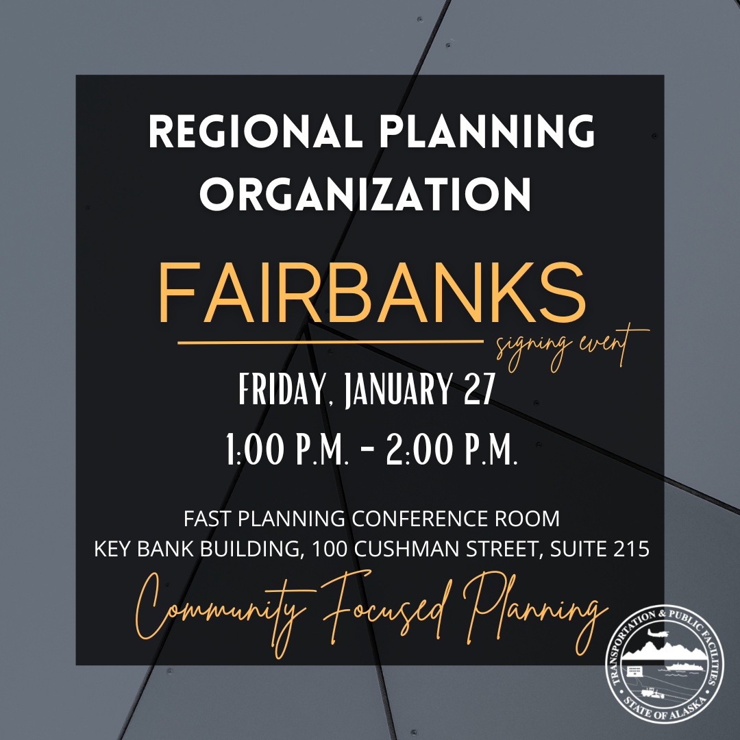 A Fairbanks Regional Transportation Planning (RPO) signing with Commissioner Anderson will take place this Friday, January 27 between 1-2 at the FAST Planning Conference Room in the Key Bank Building, 100 Cushman Street, Suite 215. These RPO's give direct community involvement in transportation planning to build stronger transportation networks with the community at the focus. For more details about the pilot program, visit: https://dot.alaska.gov/stwdplng/rpo/