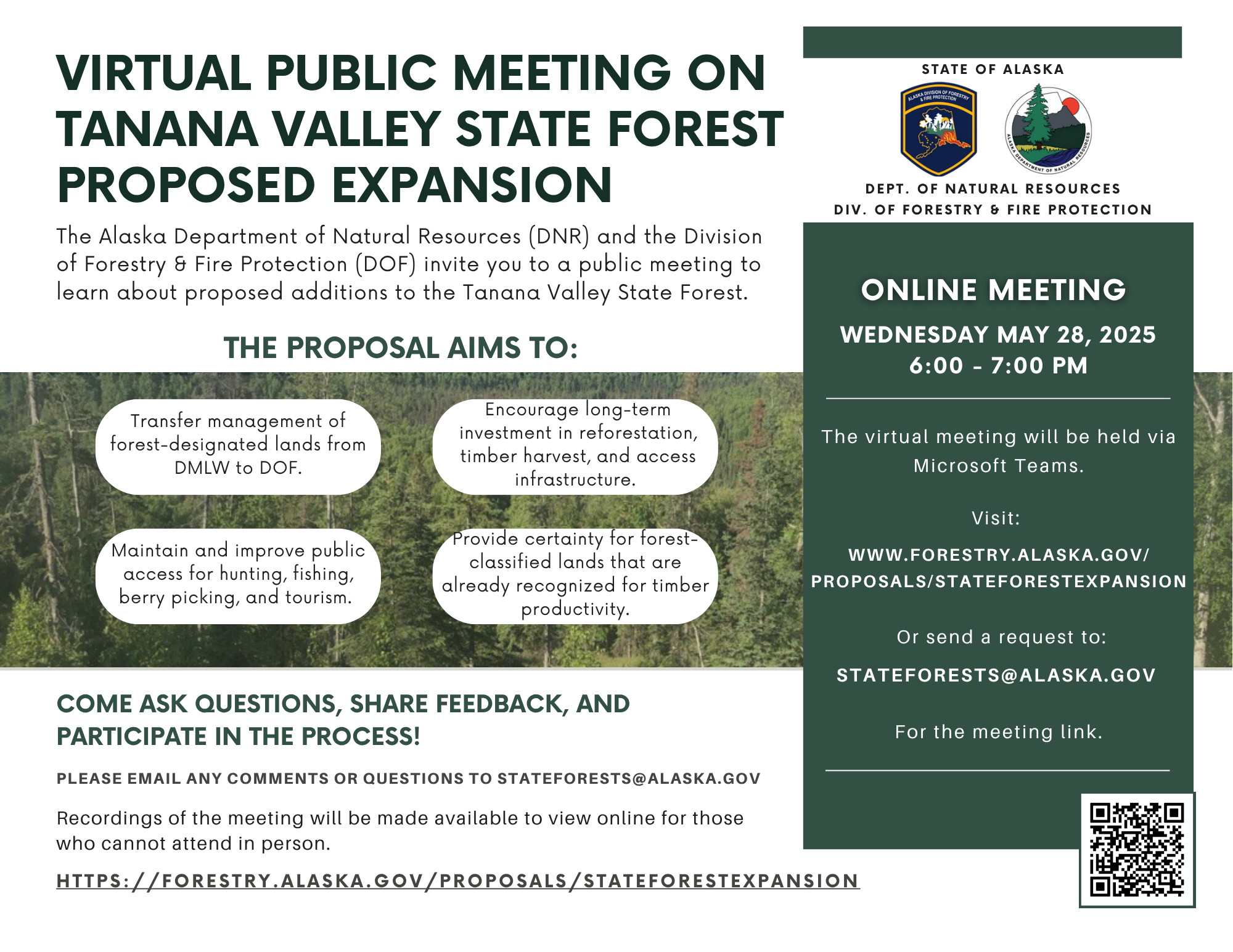 Please email any comments or questions to STATEFORESTS@ALASKA.GOV and visit https://forestry.alaska.gov/proposals/sTATEforestexpansion for more information.